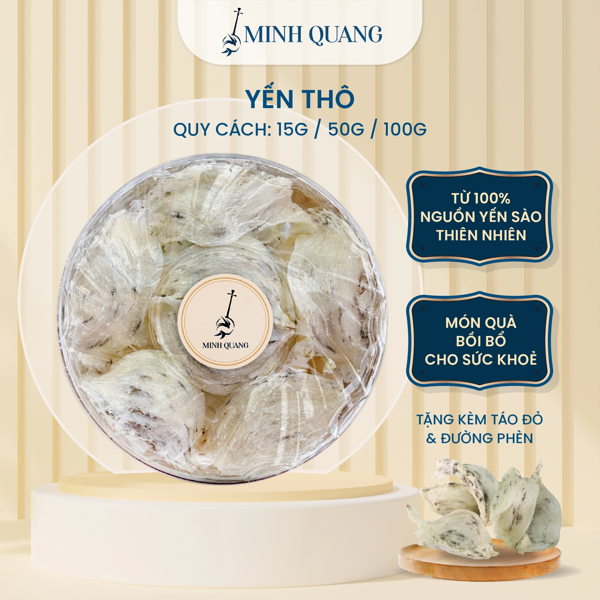 Mô tả: Tổ yến thô là nguyên liệu thô, được thu hoạch trực tiếp từ các nhà yến Minh Quang. Đây là nguyên liệu chưa qua sơ chế, giữ nguyên toàn bộ hình dáng tự nhiên và các giá trị dinh dưỡng.
